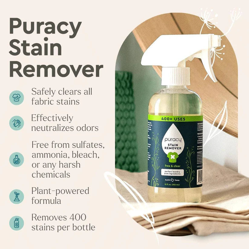 Puracy's Laundry Stain Remover is a powerful, plant-based solution that tackles both fresh and stubborn stains with ease. This professional-grade formula is designed to remove a wide variety of stains and odors, including sweat, grass, pet accidents, ink, rust, and more than 1,500 other stains. Safe for all washable fabrics—from bedding and clothes to delicate items and mattresses—this vegan, hypoallergenic spray is free from sulfates, chlorine, phosphates, and harsh chemicals. With 98.95% natural ingredients, it provides a gentle yet effective way to refresh your family’s clothes without compromising on safety or performance.