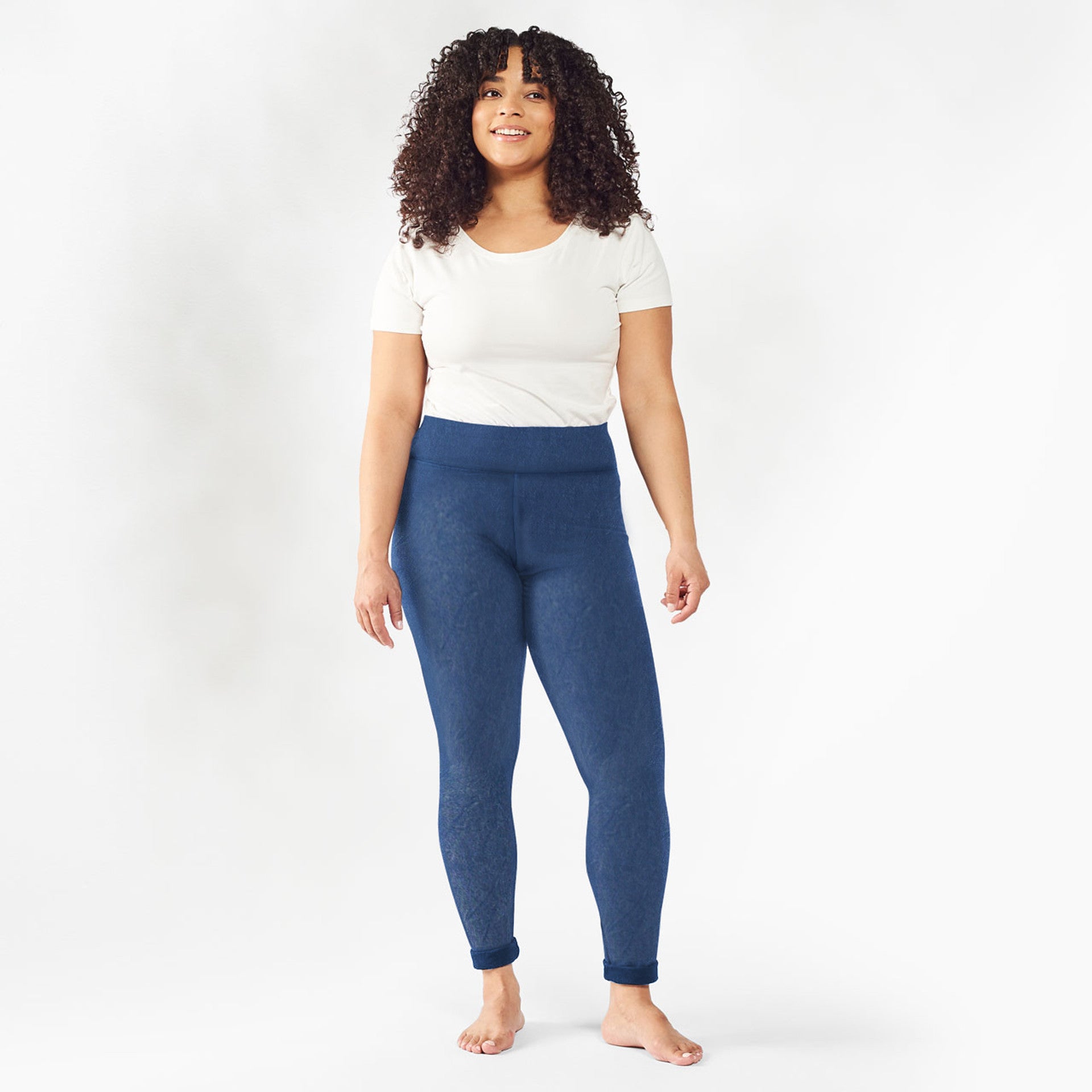 Made from exceptionally soft and stretchy 96% organic cotton fleece, these lightweight organic ankle leggings feature a gentle brushed interior for a cozy feel without unnecessary bulk. Stylishly warm with extra in-seam length for full coverage. The supportive and comfortable wide waistband ensures a mid to high-rise fit. In a distressed blue color with a vintage, weathered look achieved through the GOTS Certified Distressed technique.