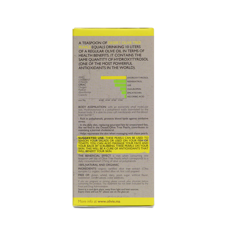 Each teaspoon of our Desert Olive Tree Pearls is packed with powerful polyphenols, delivering the same amount of hydroxytyrosol as 10 liters of regular olive oil.
