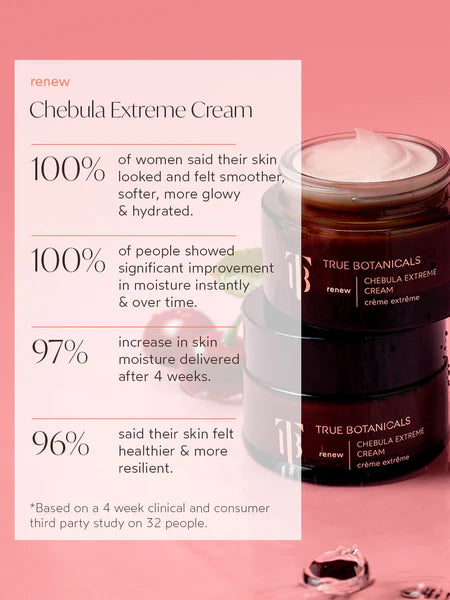 Discover this divine, anti-aging moisturizer, clinically proven to transform your skin. Powered by Chebula, an innovative antioxidant targeting five signs of aging, this unique formula deeply hydrates and rejuvenates the skin. Chebula Extreme Cream provides comprehensive anti-aging protection, leaving your skin smoother, softer, and more radiant. In independent studies, 96% of participants reported increased skin resilience within 28 days, thanks to the antioxidants and breathable occlusives that strengthen the skin barrier, essential for achieving a beautiful, glowing complexion.
