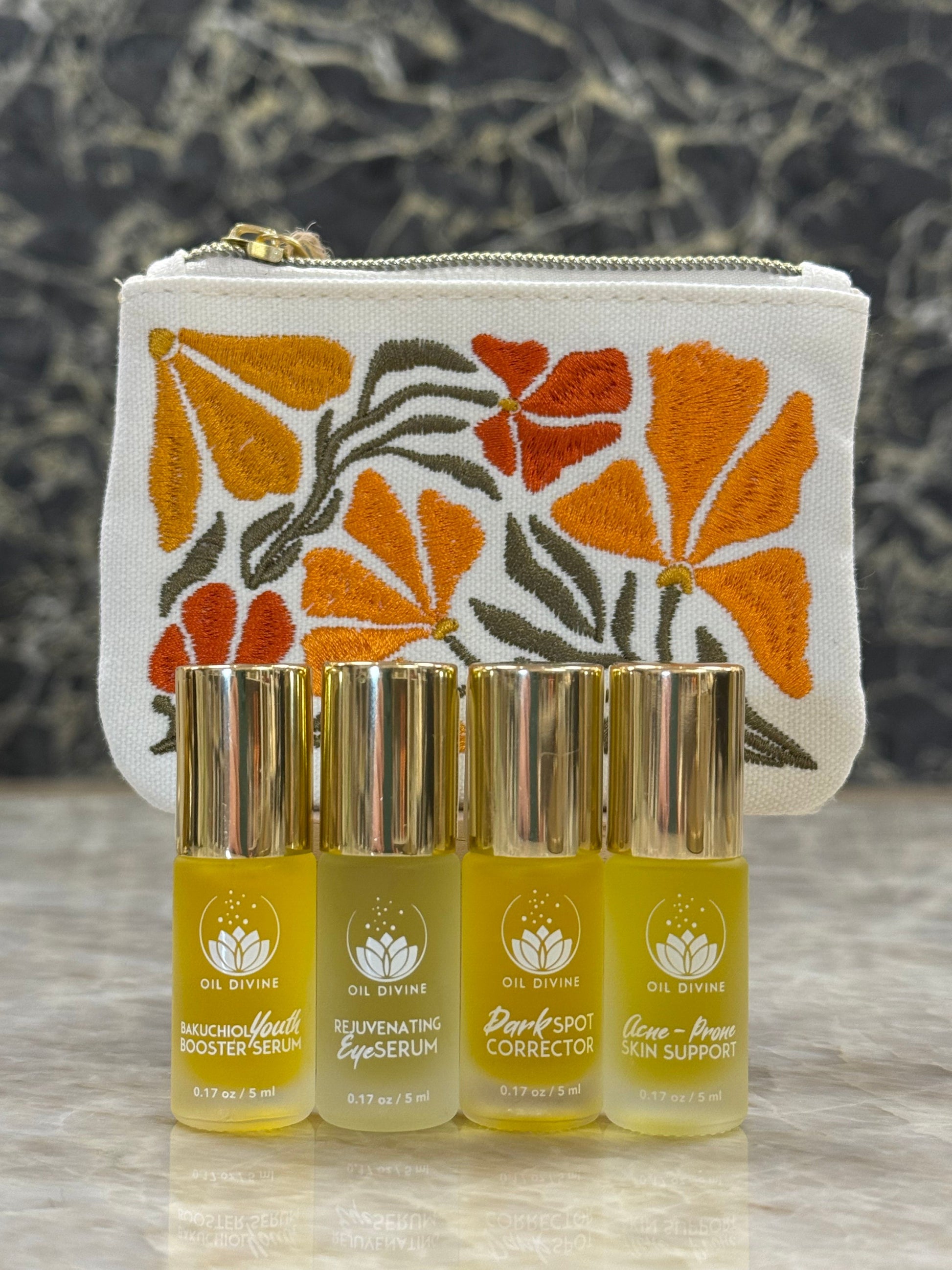 Introducing our luxurious set of four Skin Therapy Discovery Facial Rollers with the inclusion of a minimalistic, sustainably made Cosmetic Bag, exclusively from Oil Divine. Indulge in the ultimate skincare routine with our thoughtfully crafted formulations, now in 5ml travel size glass bottles, designed to elevate your skincare routine to new heights.