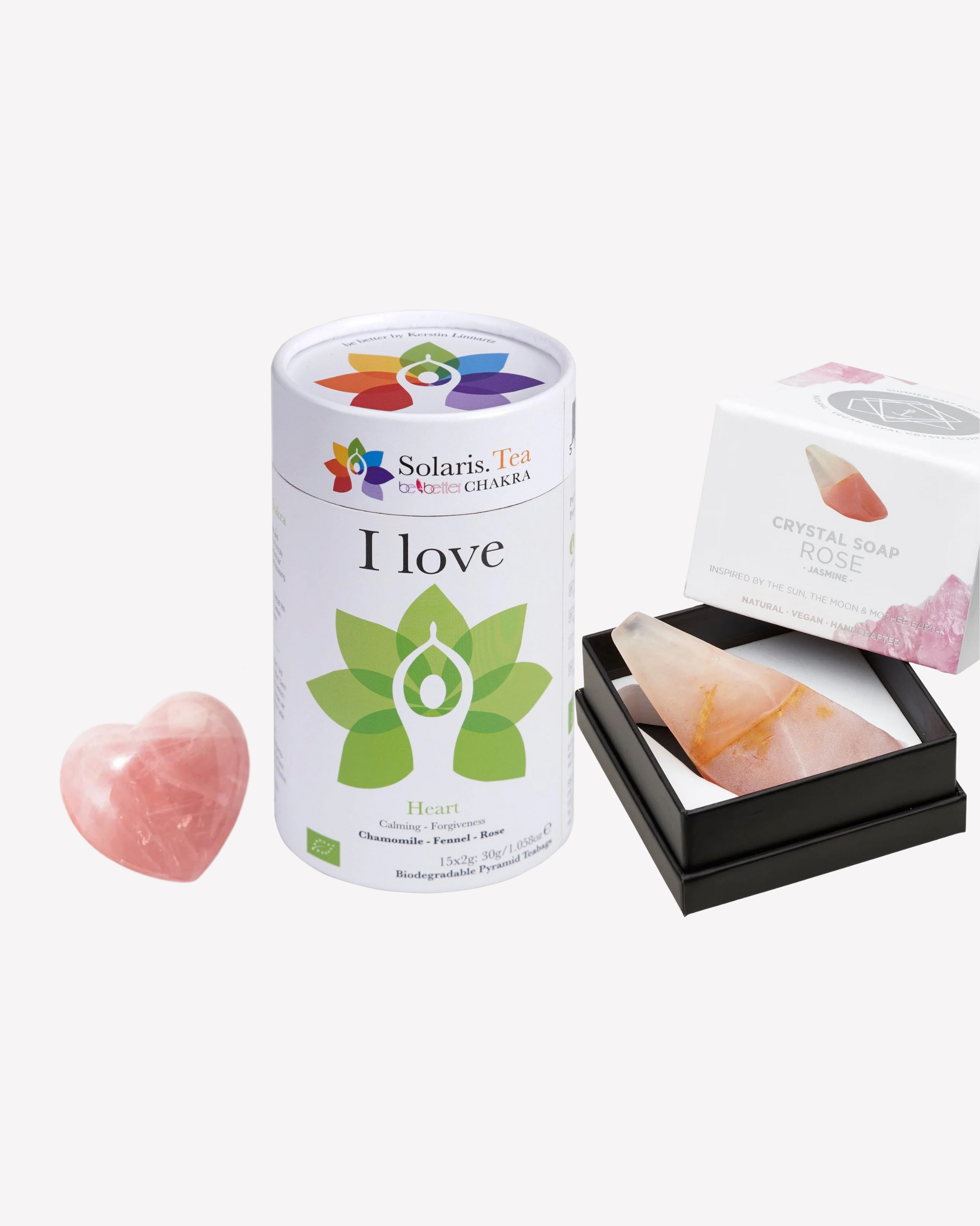 I Love” Heart Chakra Organic Tea by Solaris Tea – a soothing blend of chamomile, fennel, and rose to calm the mind, open heart chakra and nurture inner peace.